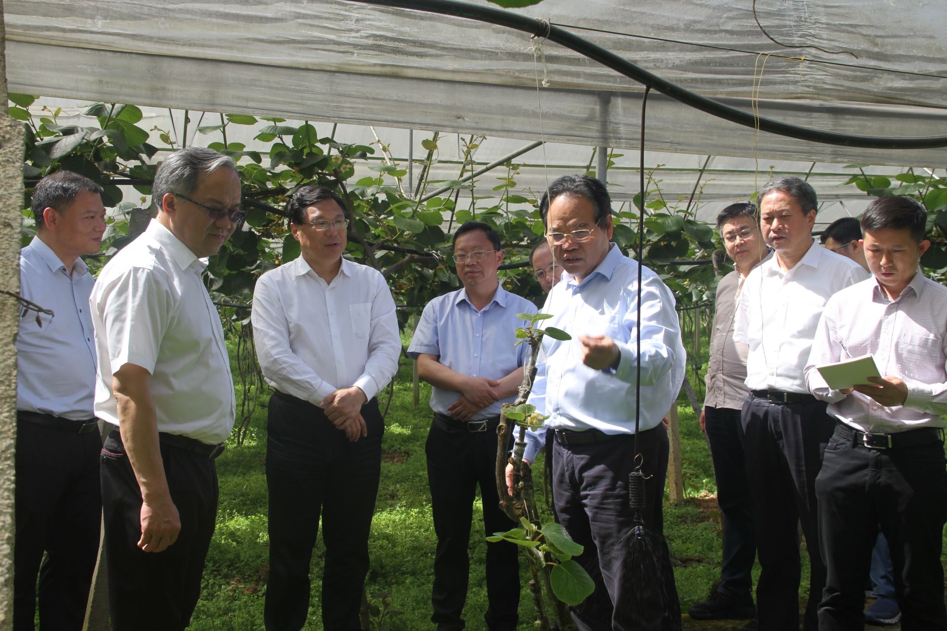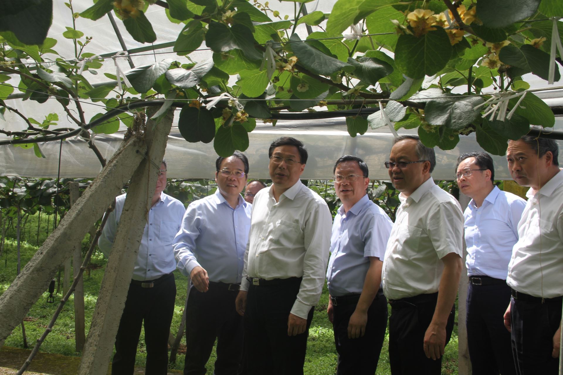 吳存榮一行來(lái)到獼猴桃基地,實(shí)地觀看了獼猴桃長(zhǎng)勢(shì)及授粉情況,洪忠進(jìn)董事長(zhǎng)向各位領(lǐng)導(dǎo)講解獼猴桃生產(chǎn)經(jīng)營(yíng)狀況并展示了水肥一體化智能操作系統(tǒng)。